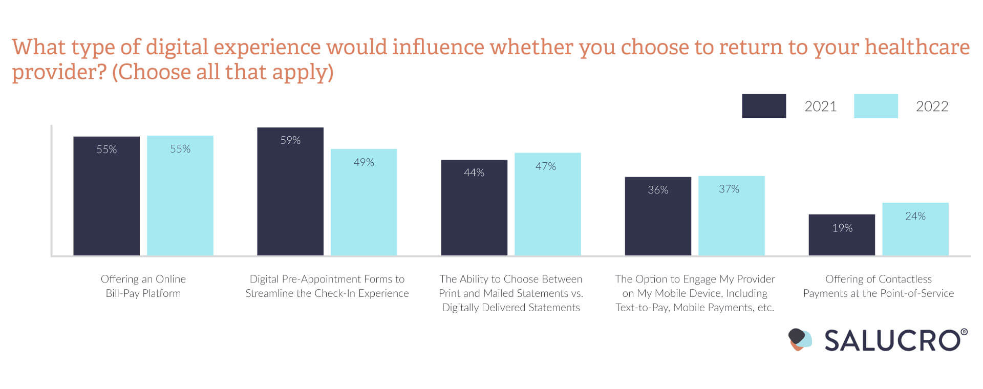 55% of patients evaluate a provider’s online bill-pay platform when choosing whether or not to return.