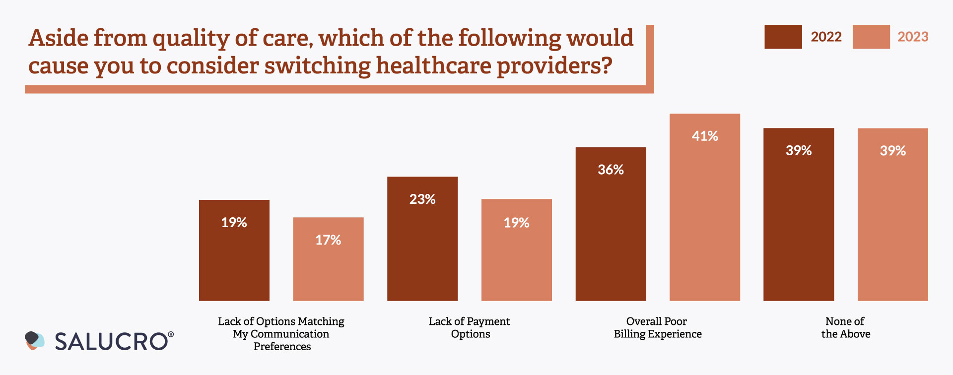 Salucro’s 2023 Trends in Patient Payment Communications report shows the significant impact that billing and communication practices have on patient loyalty and satisfaction. In a world where consumers have more choices than ever, it is essential for healthcare providers to continuously enhance their patient financial experience and communication strategies to retain patients and maintain their trust.